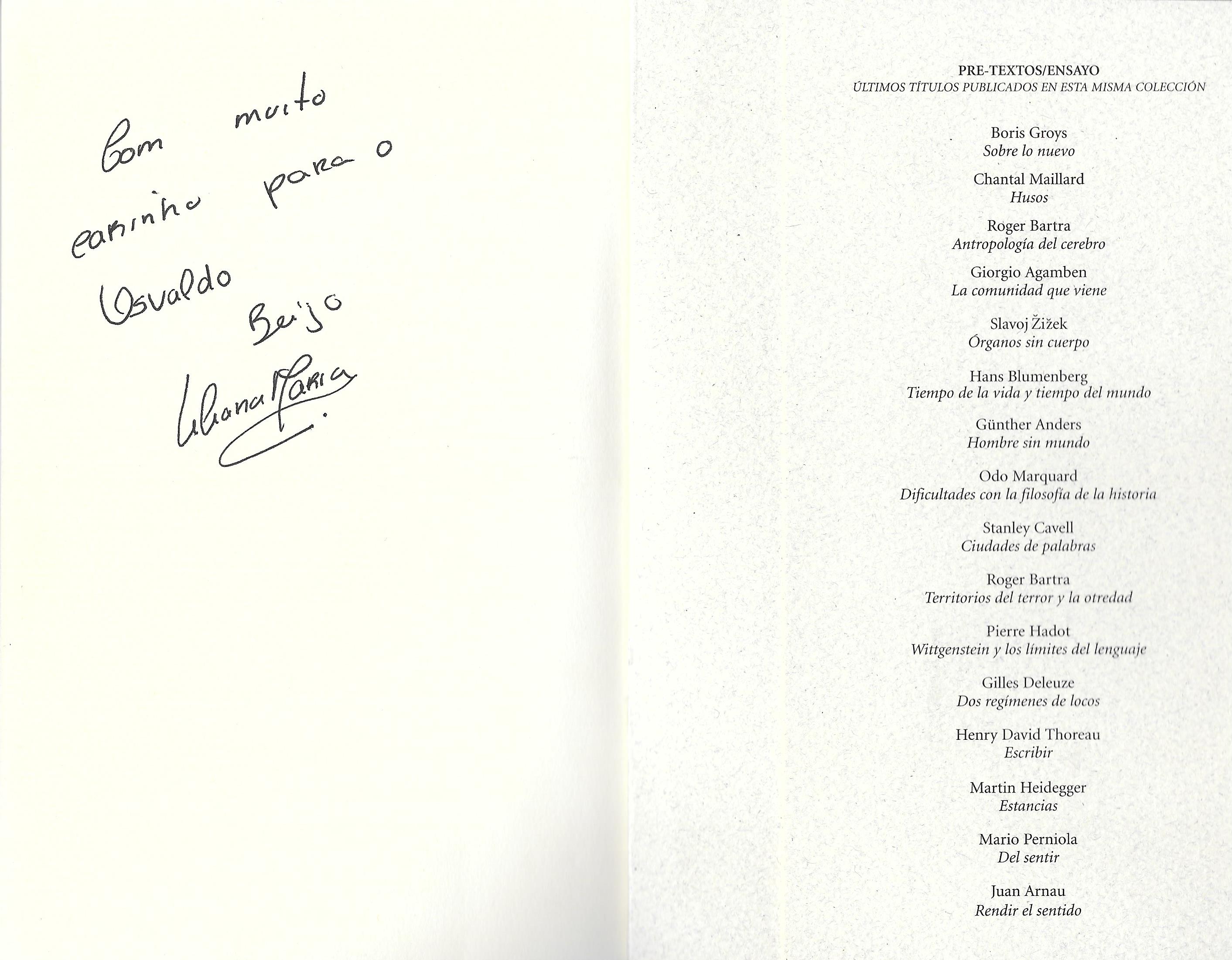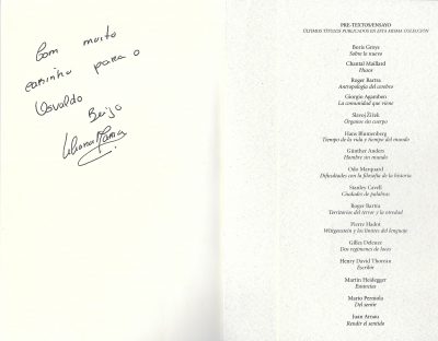 E lembro-me do Carlos na última vez em que estive com ele em Braga, quando vim fazer uma aula-conferência no então muito recente Doutoramento em Modernidades Comparadas, com o título «O que são as materialidades da literatura?» Foi o Carlos a convidar-me e a tratar da minha vinda. Por mais que eu insistisse que não precisava que ele me fosse esperar à estação, pois para isso é que há táxis, ele fez questão e foi esperar-me, levando-me depois ao hotel e à universidade. No dia seguinte, era sábado, ele fez de novo questão de me ir levar à estação. Quando chegou ao hotel havia um grande espetáculo popular na praça em frente, que metia um Outlet de uma estilista bracarense e uma emissão de rádio em direto. Cantava ao vivo uma artista pimba, uma rapariga alta e de formas generosas que, devo admitir, me causou um certo efeito. Fomos comentando a atuação e a cantora e, no fim, disse ao Carlos que esperasse um pouco pois ia pedir um autógrafo. Havia fila, composta por velhotas muito fãs, e por fim eu. Passei à cantora o livro de Boris Groys que andava a ler e pedi para autografar na última página – e cobrei os beijinhos da praxe. O Carlos ria-se, quando voltei e lhe mostrei o autógrafo, que é este e reza assim: «Com muito carinho para o Osvaldo. Beijo, Liliana Maria». Não é difícil perceber, suponho, por que razão essa dedicatória é agora, para mim, um vestígio oracular do Carlos e do sorriso divertido, mas ainda assim algo renitente, com que encarou o meu pedido de autógrafo, e o outro sorriso, já rendido, com que leu o autógrafo de Liliana Maria. Quando alguém morre, tudo serve para resistirmos ao seu desaparecimento – e tudo funciona metonimicamente (oracularmente) para esse efeito.