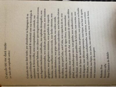 Na sua edição das “obras reunidas” de Piva, três volumes editados pela Globo em 2005, 2006 e 2008, Alcir Pécora, num gesto de largo alcance curatorial (insuficientemente reconhecido como tal), recupera e coloca no final de cada volume textos caraterizáveis como manifestos. O primeiro volume encerra com quatro manifestos coletivos, mas de facto escritos por Piva, do início dos anos 60, reunidos sob o título “Os que viram a carcaça”. No segundo volume a secção intitula-se “O século XXI me dará razão” e inclui três manifestos, datados dos anos 80. No terceiro volume a secção, “Sindicato da Natureza”, é mais vasta, incluindo nove textos desse tipo, ainda que com assinalável flutuação de género, alguns datados de 1990. Prefiro pensar que os manifestos de Piva não encerram ou fecham propriamente cada um dos volumes – isso seria atribuir ao manifesto um papel não contingente, destinado a explicitar as implicações temáticas e filosóficas, além das imagéticas, da poesia de Piva –, mas antes suturam a descontinuidade material das obras (para lá da temporal, já que a obra de Piva conviveu sempre com longos hiatos de publicação), religando-as ou reunindo-as por meio da energia particular desse tipo de texto, a que Piva só pontualmente concede a explicitude do nome “manifesto”, que aqui ganha um cariz aproximativo. O que faz sentido com a natureza declaradamente híbrida desses textos, entre o privado e o político, entre o lírico e o agonístico, enfim, entre a poesia, ou melhor, entre as várias configurações históricas do poético em Piva, e o manifesto.