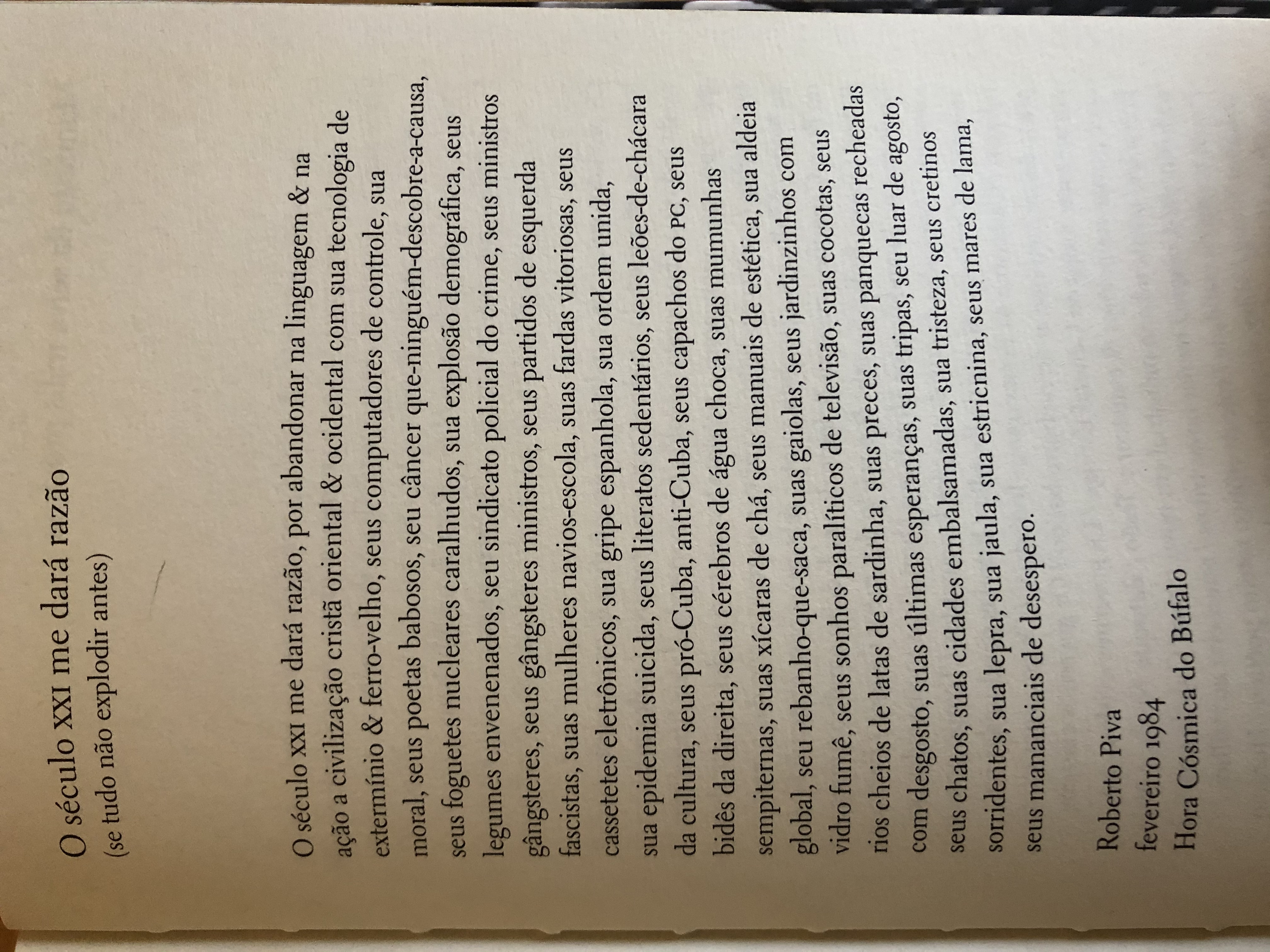 O segundo nível é aquele momento final em que Piva reescreve a data do manifesto, no original “fevereiro de 1984”, situando-a agora no “século passado”. 20 anos após a publicação do original, o “século passado” é a exigência cronológica de um manifesto que reivindica uma Razão Histórica provinda de um futuro situado no século XXI. Como, porém, é já no século XXI que se enuncia o advento dessa Razão, o fundamento diferencial do texto retrojeta a datação, criando uma fundamental incoincidência temporal entre o profético, que necessita de futuro e distância, e o apocalíptico, que necessita basicamente de um passado face ao qual se posiciona enquanto experiência de um pós-tempo. O século XXI, tal como ocorre na ficção científica que se atreve a uma datação do futuro – 1984, 2001, etc. –, torna-se um futuro ultrapassado fatalmente pelo próprio futuro e condenado a uma obsolescência só redimível ou por alegoria ou por leitura apocalíptica, o que é o caso.